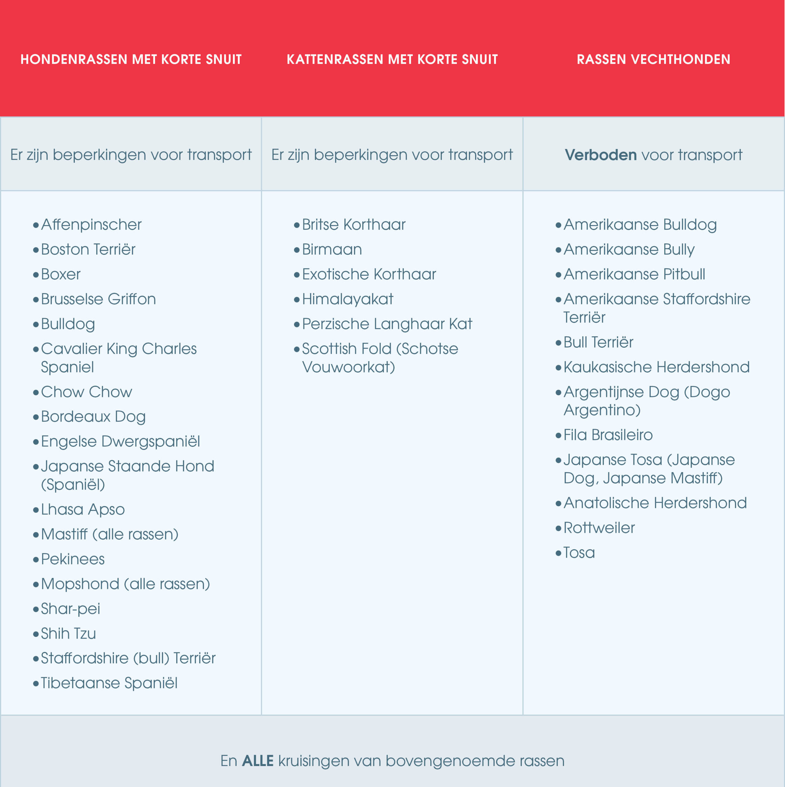Voor alle duidelijkheid vermelden we de soorten honden en katten waarvan het transport niet is toegestaan aan boord van Air Belgium-vluchten, zowel in de cabine als in het ruim.